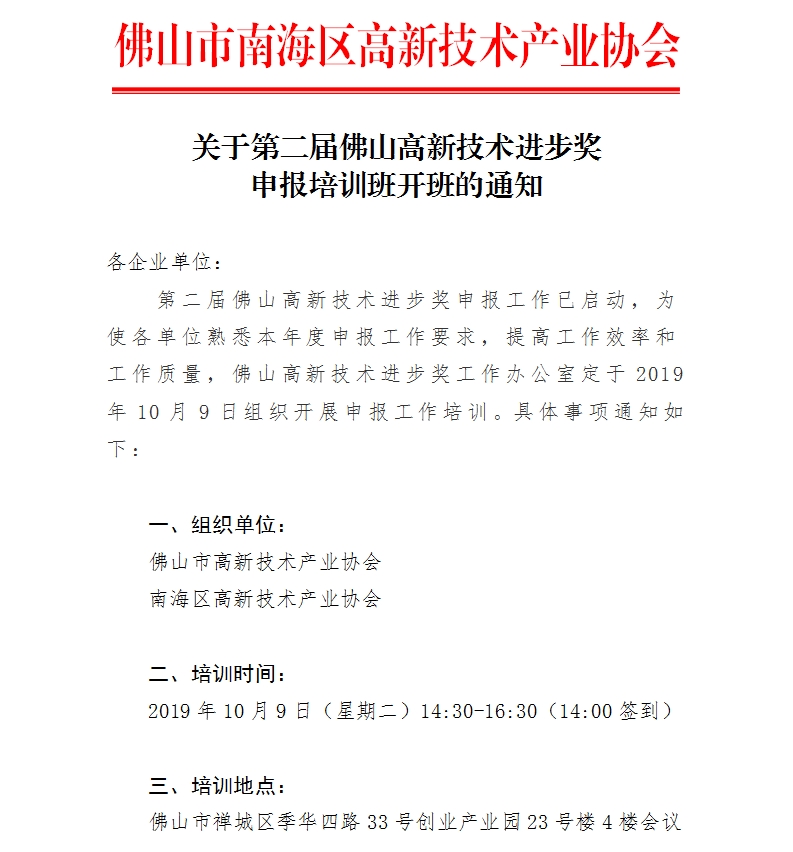 關(guān)于第二屆佛山高新技術(shù)進(jìn)步獎 申報培訓(xùn)班開班的通知