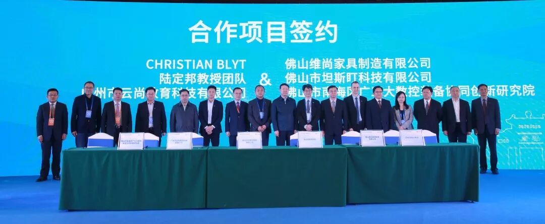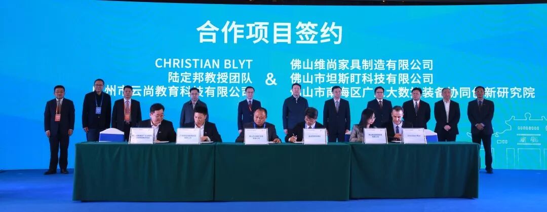 在頒獎活動上,大賽金牌導(dǎo)師、評委、加拿大艾米麗卡爾藝術(shù)與設(shè)計大學(xué)副教授Christian與維尚家具,大賽金牌導(dǎo)師、臺灣設(shè)計創(chuàng)新管理協(xié)會理事長陸定邦教授團隊與廣工大研究院孵化企業(yè)——佛山市坦斯盯科技有限公司,廣州市云尚教育科技有限公司與廣工大研究院等項目進行了合作項目簽訂儀式。